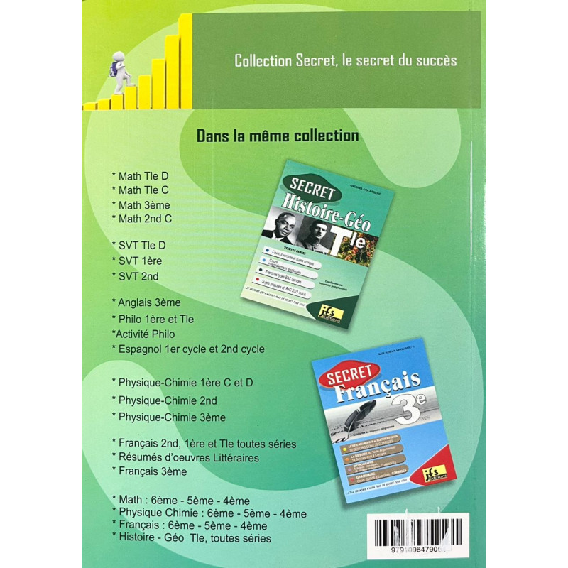‘’ SECRET‘’ est une collection d’annales au Programme interafricain allant de la 1ere à la Terminale. L’ouvrage met en avant les cours, les exercices et les sujets corrigés et en Bonus 100 sujets corrigés ; 30 textes d’appui des astuces.