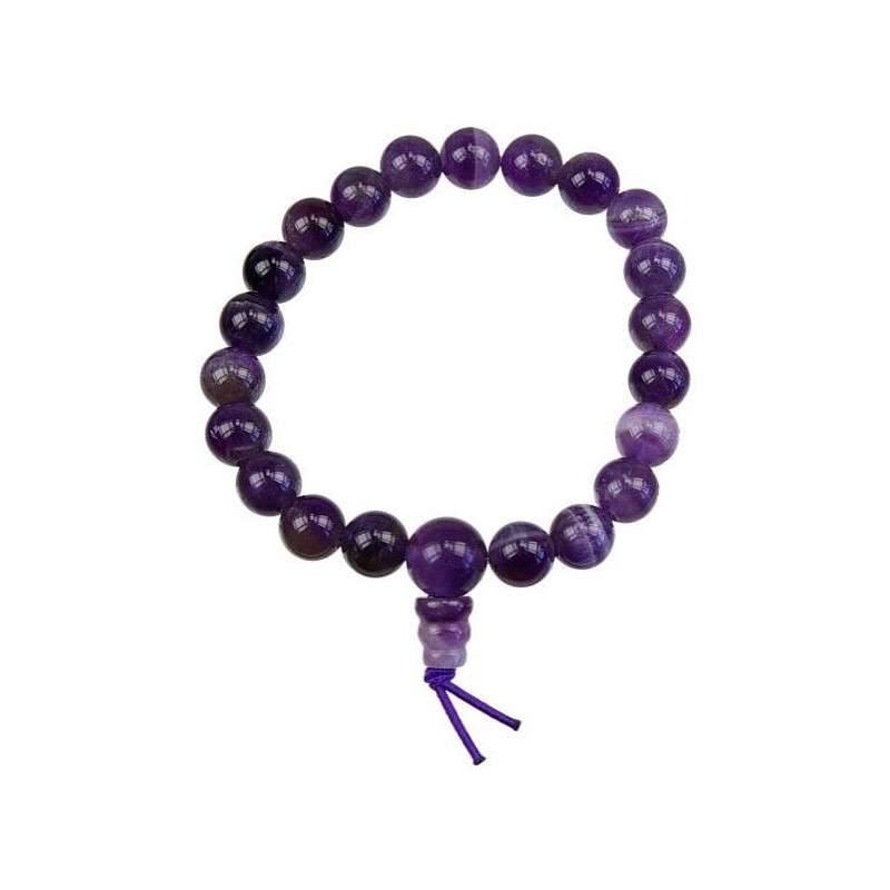 Bracelet mala en améthyste Omsaé Bracelet élastique composé de perles en pierre d'améthyste. L'améthyste développe l'imagination, la créativité et l'apaisement. Bracelet mala en pierre naturelle. Fil élastique violet. Composition du fil : polyester et caoutchouc. Diamètre du bracelet : 6 cm. Diamètre des perles : 22 perles de 0,8 cm et 1 perle de tête de 1 cm avec connecteur.