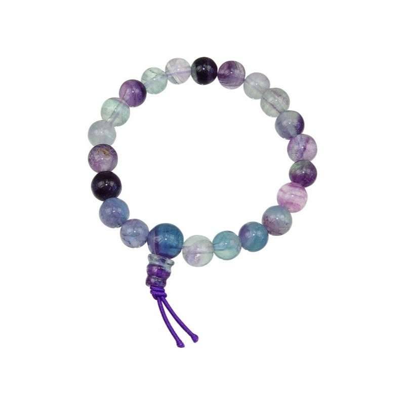 Bracelet mala en fluorite Omsaé Bracelet élastique composé de perles en pierre de fluorite. La fluorite aide au discernement, à la concentration et à l'esprit d'analyse. Bracelet mala en pierre naturelle. Fil élastique violet. Composition du fil : polyester et caoutchouc. Diamètre du bracelet : 6 cm. Diamètre des perles : 22 perles de 0,8 cm et 1 perle de tête de 1 cm avec connecteur.