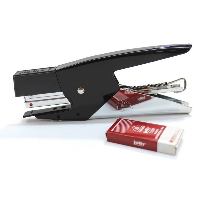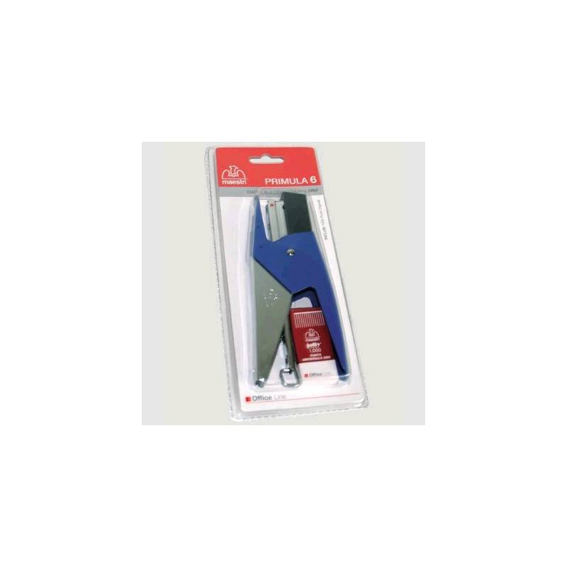 Agrafeuse idéale pour le bureau, l'école, la maison, les loisirs. Moderne et ergonomique. Couture douce et silencieuse. Indicateur de chargement ponctuel, chargement arrière. Dispositif anti-brouillage automatique. Primula 6 pour toutes les pointes au pas de 6 mm. Le forfait comprend 1000 points.