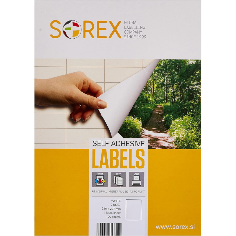 Sorex Lot de 100 feuilles A4 blanches autocollantes 210 x 297 mm étiquettes universelles pour tous les besoins de dessin, marquage, classement,...