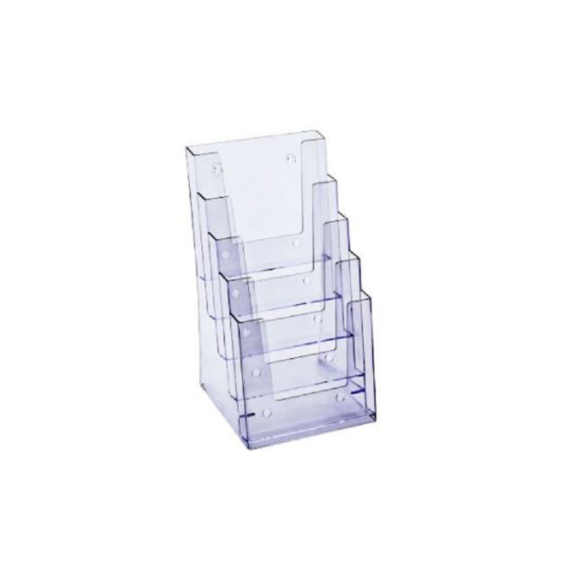 Le présentoir A4 est un présentoir 5 compartiments pour documents A4. Le présentoir A4 est composé de plexiglas transparent moulé en un seul tenant par injection, pour disposer cinq modèles de dépliants, flyers A4 dans chacun des compartiments de 33 mm de profondeur. Le porte brochure A4 est vendu à l'unité mais dispose d'un tarif dégressif par quantité. Le présentoir A4 pour documents A4 à l'unité