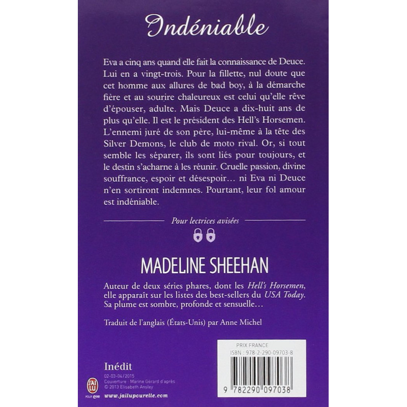 Eva a cinq ans quand elle fait la connaissance de Deuce. Lui en a vingt-trois. Pour la fillette, nul doute que cet homme aux allures de bad boy, à la démarche fière et au sourire chaleureux est celui qu'elle rêve d'épouser, adulte. Mais Deuce a dix-huit ans de plus qu'elle. Il est le président des Hell's Horsemen. L'ennemi juré de son père, lui-même à la tête des Silver Demons, le club de moto rival. Or, si tout semble les séparer, ils sont liés pour toujours, et le destin s'acharne à les réunir. Cruelle passion, divine souffrance, espoir et désespoir... ni Eva ni.Deuce n'en sortiront indemnes. Pourtant, leur fol amour est indéniable.