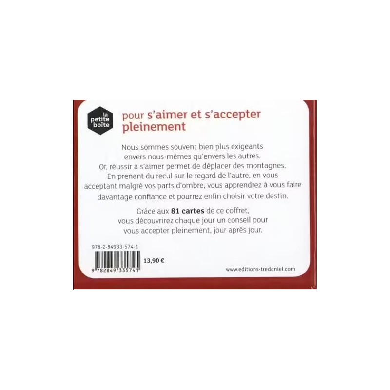 Nous sommes souvent bien plus exigeants envers nous-mêmes qu'envers les autres. Or, réussir à s'aimer permet de déplacer des montagnes. En prenant du recul sur le regard de l'autre, en vous acceptant malgré vos parts d'ombre, vous apprendrez à vous faire davantage confiance et pourrez enfin choisir votre destin. Grâce aux 81 cartes de ce coffret, vous découvrirez chaque jour un conseil pour vous accepter pleinement, jour après jour.