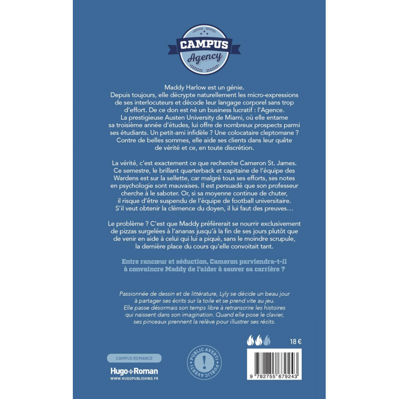 Plongez dans la trilogie Campus Agency avec Queen Of Minds (Tome 1), Out Of My Minds (Tome 2) et Mind Your Business (tome 3), des romances à découvrir indépendamment, dans l'ordre que vous voulez ! Maddy Harlow est un génie. Depuis toujours, elle décrypte naturellement les micro-expressions de ses interlocuteurs et décode leur langage corporel sans trop d'effort. De ce don est né un business lucratif : l'Agence.