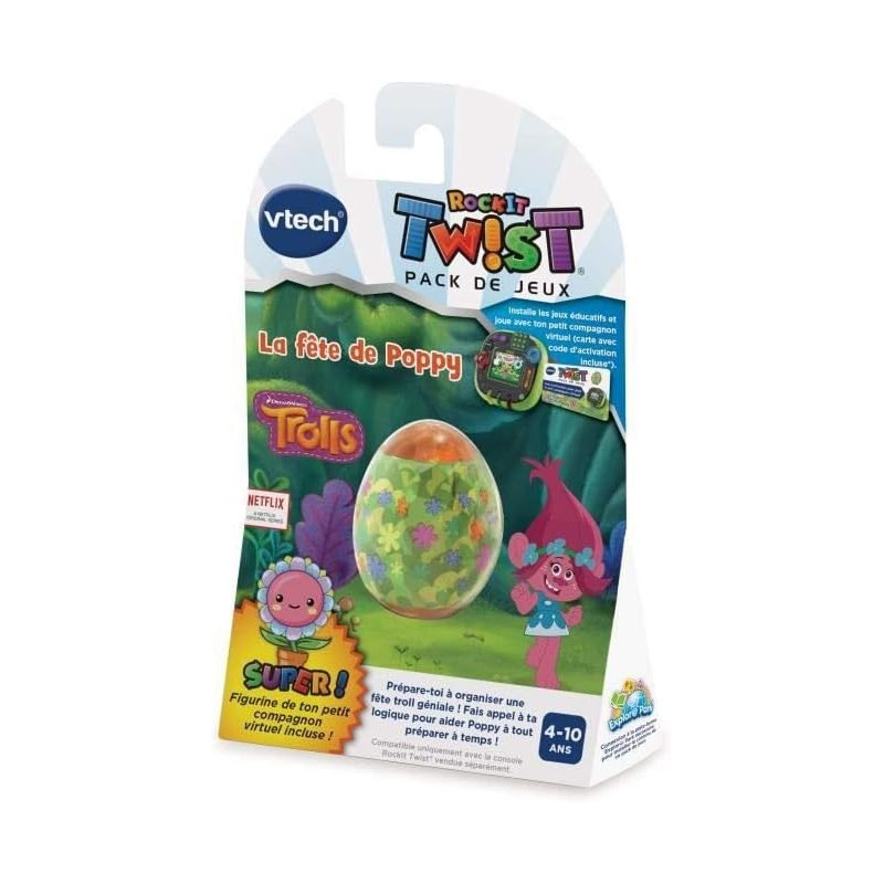 RockIt Twist - Jeu éducatif « Trolls – La fête de Poppy » – 4 - 10 ans. Poppy a besoin d'aide !. L'enfant fait donc appel à sa logique et son observation pour l'aider organiser la meilleure des fêtes !. Apprentissages : observation, logique, créativité, musique. Compatible avec la console Twist. Inclus : une figurine fleur à collectionner et sa version digitale dont il faut prendre soin.