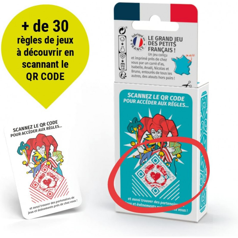 Découvrez un jeu de 54 cartes au design moderne et aux couleurs pop ! Fini les soirées à jouer à la Bataille ! Scannez le QR Code et découvrez une multitude de règles populaires, expliquées simplement : Poker, Président, Palmito, 8 Américain.