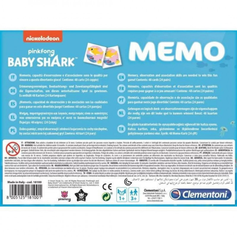 Un jeu classique pour développer ses capacités d'observation et sa mémoire, contenant 48 cartes avec des images de Baby Shark. Grâce aux images colorées et aux personnages de Baby Shark, défier ses amis en mémorisant autant d'images que possible sera encore plus amusant ! Le but du jeu est de combiner le plus grand nombre de paires. Fabriqué en Italie.