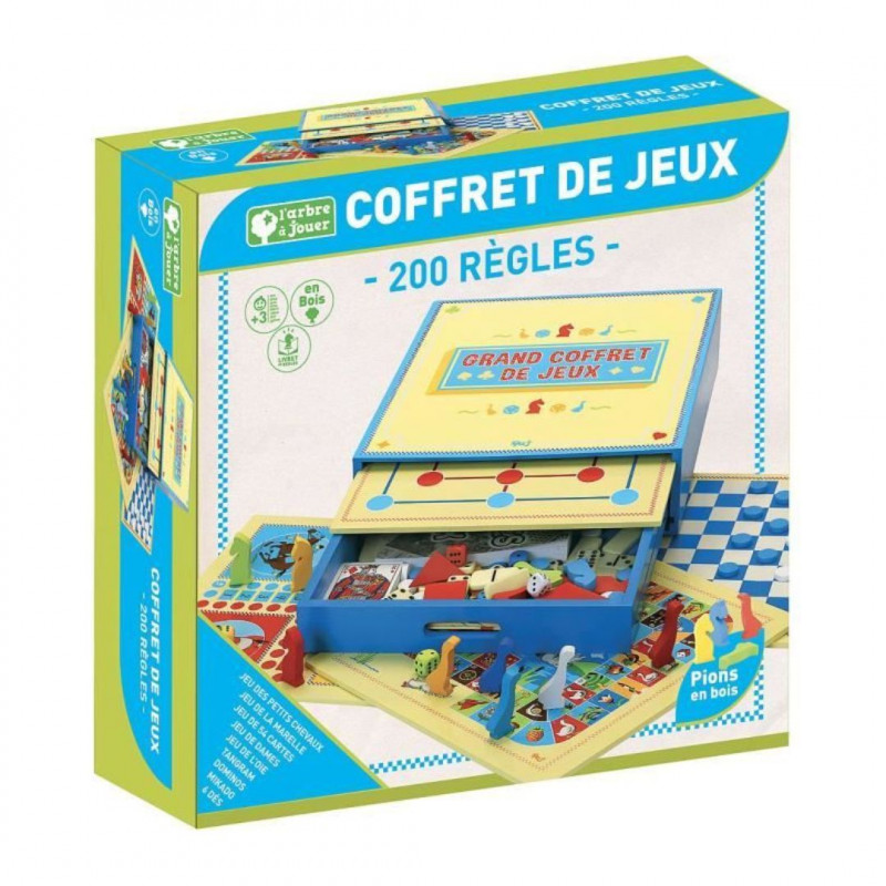 Grand coffret de jeux - 200 regles : jeux des petits chevaux, oie, dames, marelle, mikado, tangram, dominos, jeu de 54 cartes. Tiroir pour ranger toutes les pieces, pions en bois et livret de regles. Dimensions du coffret en bois : 30 x 30 x 8 cm. A partir de 3 ans.