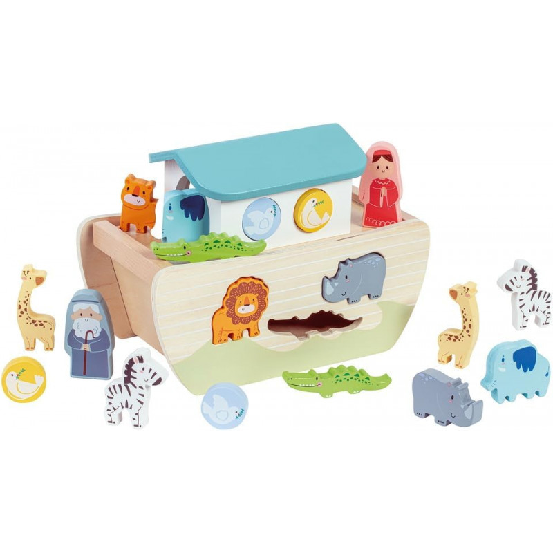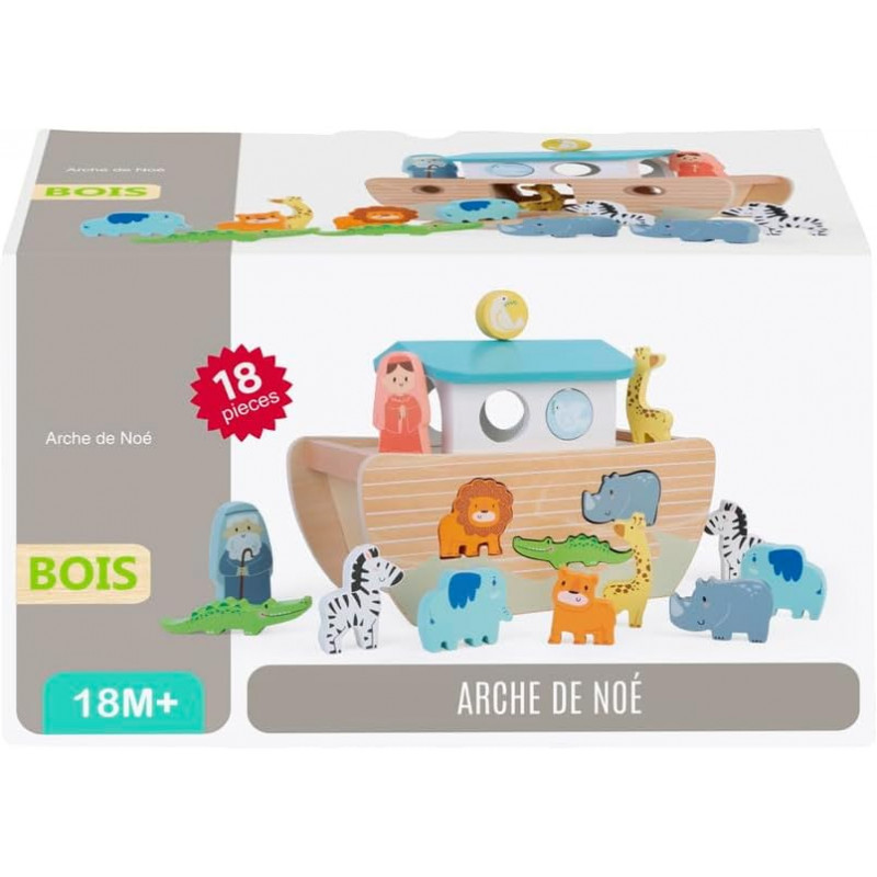 Arche de Noé en bois : rejoue l'histoire de l'Arche de Noé avec ce bateau de 26 cm et ses formes d'animaux en bois à encastrer. 18 pièces incluses. Dès 18 mois.