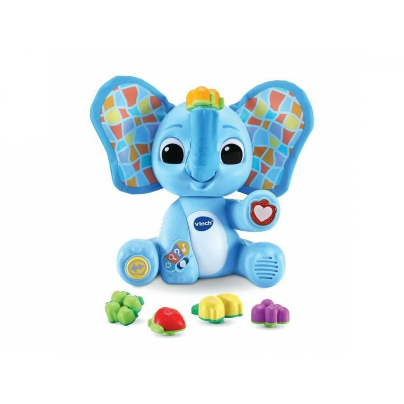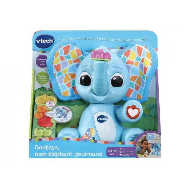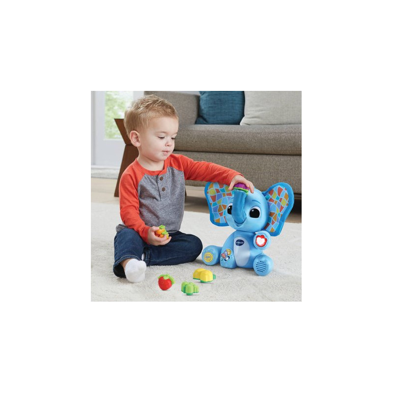 Un éléphant trop amusant qui joue à coucou caché et reconnaît les fruits ! Un éléphant animé qui joue à coucou caché et reconnaît les fruits ! Ses oreilles animées promettent des parties de coucou caché ! Grâce à sa trompe magique animée, l’éléphant peut reconnaître les 5 fruits et permet à l’enfant d’apprendre les chiffres, les couleurs, les fruits, leurs goûts et leurs textures. En mode découverte, l’enfant découvre les fruits. En mode quiz, il approfondit ses apprentissages. En mode musique, il écoute des chansons rigolotes. En appuyant sur le cœur lumineux, l’enfant découvre des anecdotes et des phrases amusantes. Un autre bouton déclenche des bruits d’animaux de la nature. 4 modes de jeu différents. Arrêt automatique.