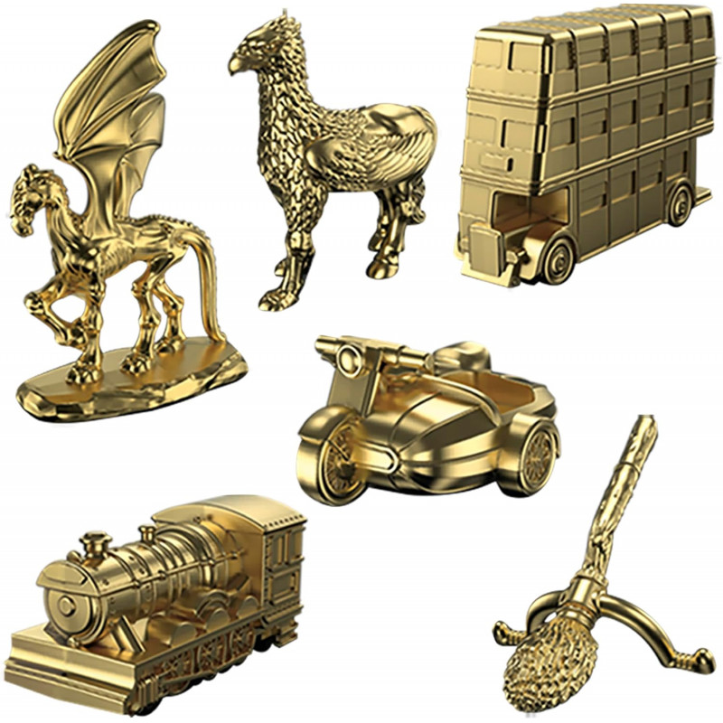 • PIONS DORÉS EMBLÉMATIQUES : Les joueurs parcourent le plateau avec l’un des six pions dorés à thème de transports enchantés : Hippogriffe, Magicobus, Poudlard Express, la moto de Hagrid, Sombral et Éclair de Feu.