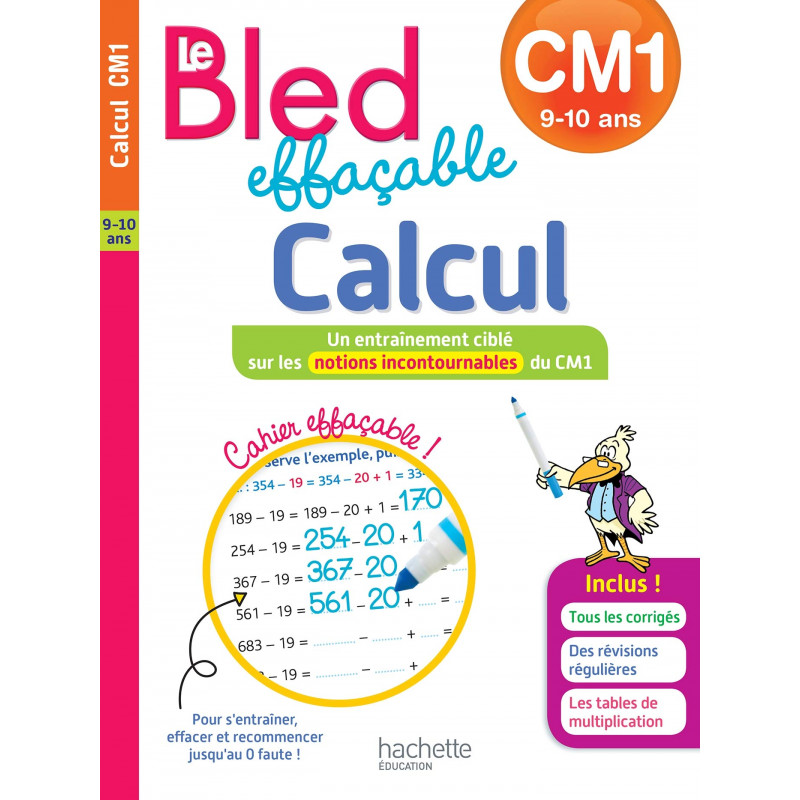 Cahier effaçable : à utiliser avec un feutre effaçable à pointe fine et un petit chiffon ! Vous souhaitez que votre enfant maîtrise le calcul mental et les opérations incontournables du CM1 ? Ce cahier vous offre un entraînement ciblé sur les 26 notions-clés du CM1. - Une page par notion, pour s'entraîner et recommencer aussi souvent que vous le souhaitez ! - Des révisions régulières - Tous les corrigés détachables au centre du cahier.