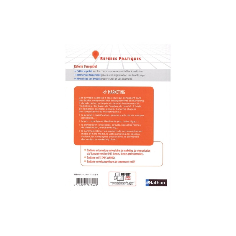 Grâce aux ouvrages de la collection Repères Pratiques : - Faites le point sur les connaissances essentielles à maîtriser. - Mémorisez facilement grâce à une organisation par double page. - Réussissez vos études supérieures et vos examens ! Cet ouvrage s'adresse à tous ceux qui s'engagent dans des études comportant des enseignements en marketing. Il est actualisé pour intégrer les dernières tendances du marketing, les données statistiques les plus récentes et de nombreux exemples très actuels.