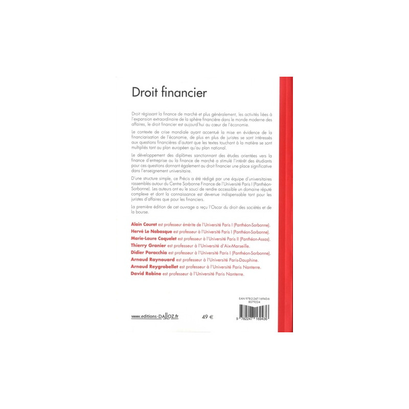 Le développement des diplômes sanctionnant des études orientées vers la finance d'entreprise ou la finance de marché a stimulé l'intérêt des étudiants pour ces questions donnant également au droit financier une place significative dans l'enseignement universitaire. D'une structure simple, ce Précis a été rédigé par une équipe d'universitaires rassemblés autour du Centre Sorbonne Finance de l'Université Paris I (Panthéon-Sorbonne).