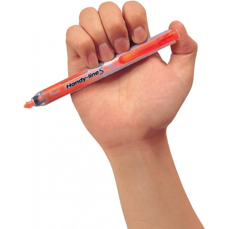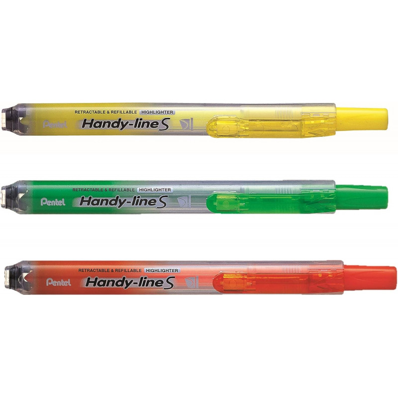Pochette de 3 surligneurs Handy-line S rétractables et rechargeables. Corps fin. Equipé d'une agrafe. Pointe biseautée fine (tracé de 1 à 3.6 mm). encre à base d'eau. Clapet hermétique évitant tout séchage de la pointe. Système d'auto rétractabilité de la pointe. Utilise des recharges SLR3.