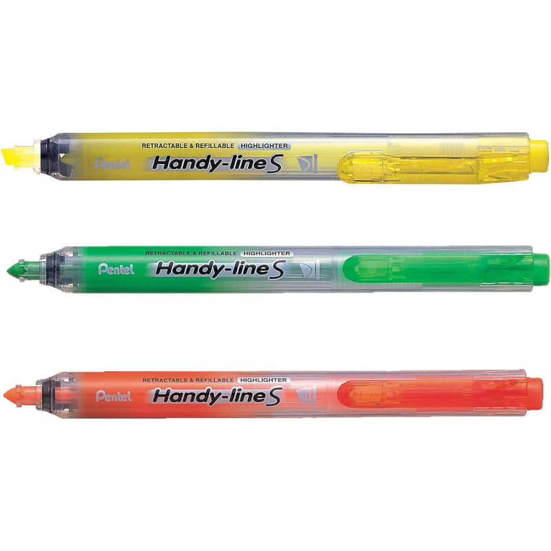 Pochette de 3 surligneurs Handy-line S rétractables et rechargeables. Corps fin. Equipé d'une agrafe. Pointe biseautée...