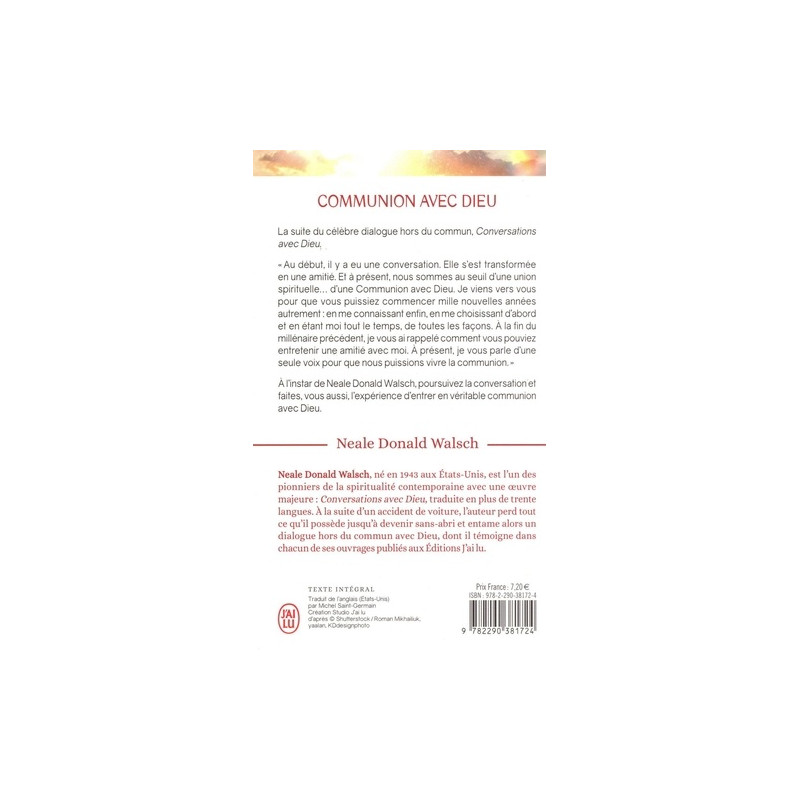 La suite du célèbre dialogue hors du commun, Conversations avec Dieu. "Au début, il y a eu une conversation. Elle s'est transformée en une amitié. Et à présent, nous sommes au seuil d'une union spirituelle... d'une Communion avec Dieu. Je viens vers vous pour que vous puissiez commencer mille nouvelles années autrement : en me connaissant enfin, en me choisissant d'abord et en étant moi tout le temps, de toutes les façons. À la fin du millénaire précédent, je vous ai rappelé comment vous pouviez entretenir une amitié avec moi. À présent, je vous parle d'une seule voix pour que nous puissions vivre la communion." À l'instar de Neale Donald Walsch, poursuivez la conversation et faites, vous aussi, l'expérience d'entrer en véritable communion avec Dieu.