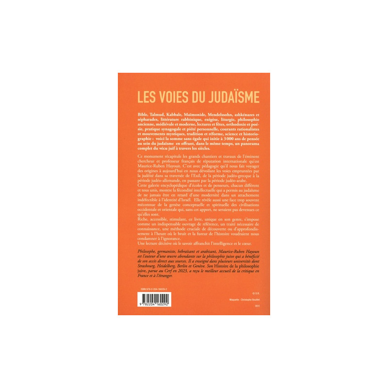 Bible, Talmud, Kabbale, Maïmonide, Mendelssohn, ashkénazes et sépharades, littérature rabbinique, exégèse, liturgie, philosophie ancienne, médiévale et moderne, lectures et fêtes, orthodoxie et poésie, pratique synagogale et piété personnelle, courants rationalistes et mouvements mystiques, tradition et réforme, science et historiographie : voici la somme sans égale qui initie à 3 000 ans de pensée au sein du judaïsme en offrant, dans le même temps, un panorama complet du vécu juif à travers les siècles. Ce monument récapitule les grands chantiers et travaux de l'éminent chercheur et professeur français de réputation internationale qu'est Maurice-Ruben Hayoun. C'est avec pédagogie qu'il nous fait voyager des origines à aujourd'hui en nous dévoilant les voies empruntées par la judéité dans sa traversée de l'Exil, de la période judéo-grecque à la période judéo-allemande, en passant par la période judéo-arabe. Cette galerie encyclopédique d'écoles et de penseurs, chacun différent et tous unis, montre la fécondité intellectuelle qui a permis au judaïsme de ne jamais être en retard d'une modernité dans un attachement indéfectible à l'identité d'Israël. Elle révèle aussi une face trop souvent méconnue de la genèse conceptuelle et spirituelle des civilisations occidentale et orientale qui, sans cet apport, ne seraient pas devenues ce qu'elles sont. Riche, accessible, stimulant, ce livre, unique en son genre, s'impose comme un indispensable ouvrage de référence, un traité nécessaire de connaissance, une méthode cruciale de découverte ou d'approfondissement à l'heure où le bruit et la fureur de l'histoire voudraient nous condamner à l'ignorance. Une lecture décisive où le savoir affranchit l'intelligence et le coeur. Philosophe, germaniste, hébraïsant et arabisant, Maurice-Ruben Hayoun est l'auteur d'une oeuvre abondante sur la philosophie juive qui a bénéficié de son accès direct aux sources. Il a enseigné dans plusieurs universités dont Strasbourg, Heidelberg, Berlin et Genève. Son Histoire de la philosophie juive, parue au Cerf en 2023, a reçu le meilleur accueil de la critique en France et à étranger.