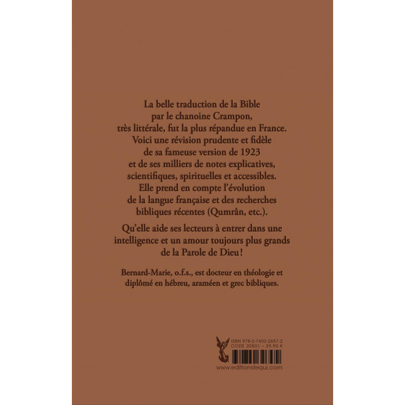 La belle traduction de la Bible par le chanoine Crampon, très littérale, fut la plus répandue en France. Voici une révision prudente et fidèle de sa fameuse version de 1923 et de ses milliers de notes explicatives, scientifiques, spirituelles et accessibles. Elle prend en compte l'évolution de la langue française et des recherches bibliques récentes (Qumran, etc.). Qu'elle aide ses lecteurs à entrer dans une intelligence et un amour toujours plus grands de la Parole de Dieu !