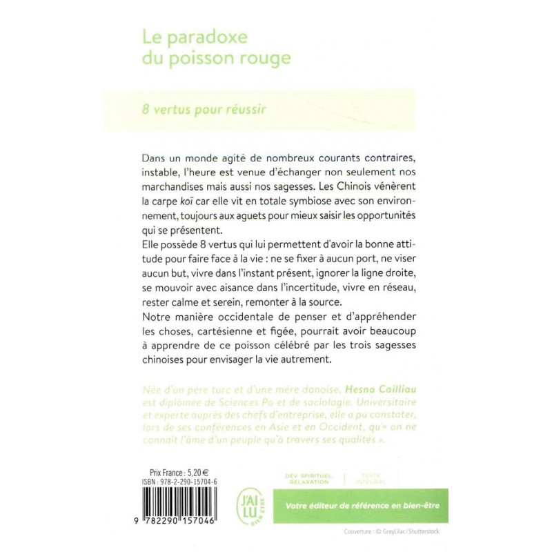 Dans un monde agité de nombreux courants contraires, instable, l'heure est venue d'échanger non seulement nos marchandises mais aussi nos sagesses. Les Chinois vénèrent la carpe koï car elle vit en totale symbiose avec son environnement, toujours aux aguets pour mieux saisir les opportunités qui se présentent. Elle possède 8 vertus qui lui permettent d'avoir la bonne attitude pour faire face à la vie : ne se fixer à aucun port, ne viser aucun but, vivre dans l'instant présent, ignorer la ligne droite, se mouvoir avec aisance dans l'incertitude, vivre en réseau, rester calme et serein, remonter à la source. Notre manière occidentale de penser et d'appréhender les choses, cartésienne et figée, pourrait avoir beaucoup à apprendre de ce poisson célébré par les trois sagesses chinoises pour envisager la vie autrement.