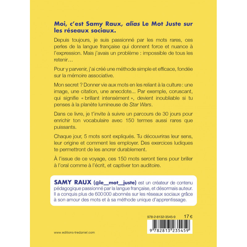 Moi, c'est Samy Raux, alias Le Mot Juste sur les réseaux sociaux. Depuis toujours, je suis passionné par les mots rares, ces perles de la langue française qui donnent force et nuance à l'expression. Mais j'avais un problème : impossible de tous les retenir... Pour y parvenir, j'ai créé une méthode simple et efficace, fondée sur la mémoire associative. Mon secret ? Donner vie aux mots en les reliant à la culture : une image, une citation, une anecdote...