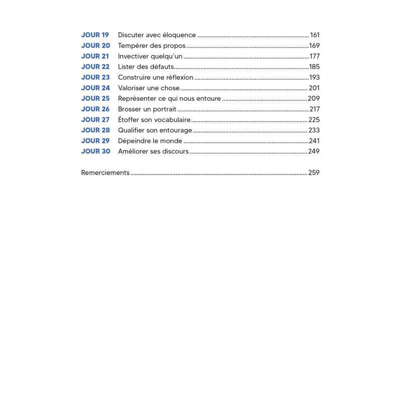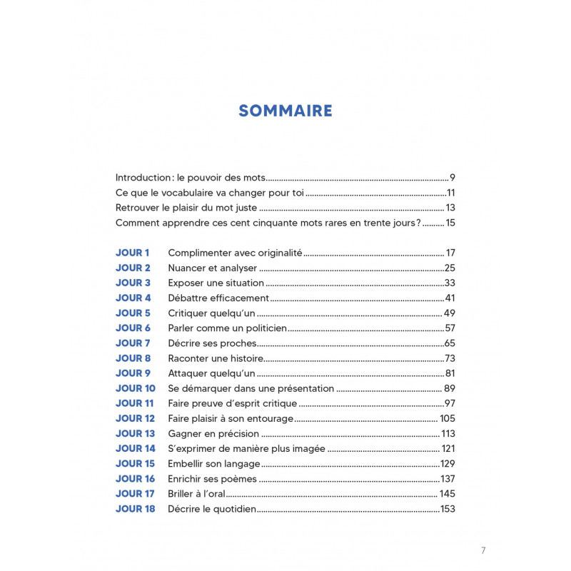 Par exemple, coruscant, qui signifie "brillant intensément", devient inoubliable si tu penses à la planète lumineuse de Star Wars. Dans ce livre, je t'invite à suivre un parcours de 30 jours pour enrichir ton vocabulaire avec 150 termes aussi rares que puissants. Chaque jour, 5 mots sont expliqués. Tu découvriras leur sens, leur origine et comment les employer. Des exercices ludiques te permettront de les ancrer durablement.