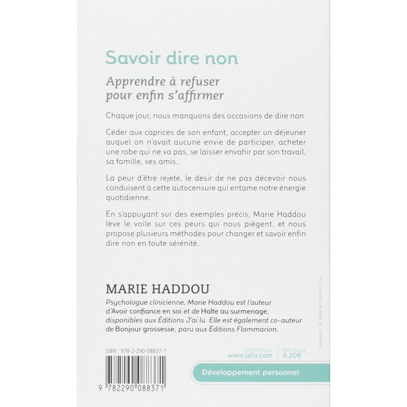 Chaque jour, nous manquons des occasions de dire non. Céder aux caprices de son enfant, accepter un déjeuner auquel on n'avait aucune envie de participer, acheter une robe qui ne va pas, se laisser envahir par son travail, sa famille, ses amis... La peur d'être rejeté, le désir de ne pas décevoir nous conduisent à cette autocensure qui entame notre énergie quotidienne. En s'appuyant sur des exemples précis, Marie Haddou lève le voile sur ces peurs qui nous piègent, et nous propose plusieurs méthodes pour changer et savoir enfin dire non en toute sérénité.