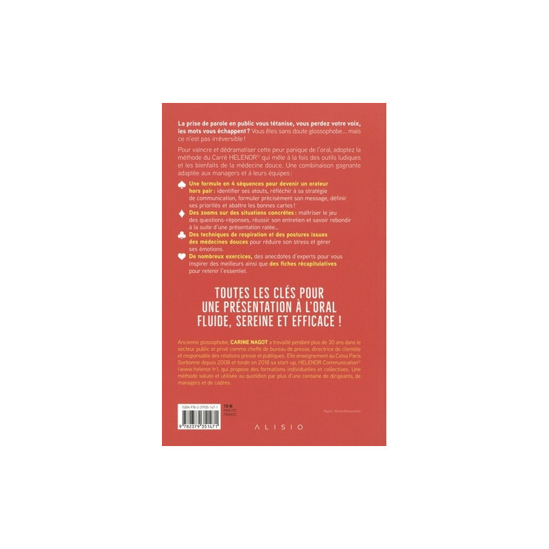 La prise de parole en public vous tétanise, vous perdez votre voix, les mots vous échappent ? Vous êtes sans doute glossophobe... mais ce n'est pas irréversible ! Pour vaincre et dédramatiser cette peur panique de l'oral, adoptez la méthode du Carré HELENOR© qui mêle à la fois des outils ludiques et les bienfaits de la médecine douce. Une combinaison gagnante adaptée aux managers et à leurs équipes : Une formule en 4 séquences pour devenir un orateur hors pair : identifier ses atouts, réfléchir à sa stratégie de communication, formuler précisément son message, définir ses priorités et abattre les bonnes cartes ! Des zooms sur des situations concrètes : maîtriser le jeu des questions-réponses, réussir son entretien et savoir rebondir à la suite d'une présentation ratée...