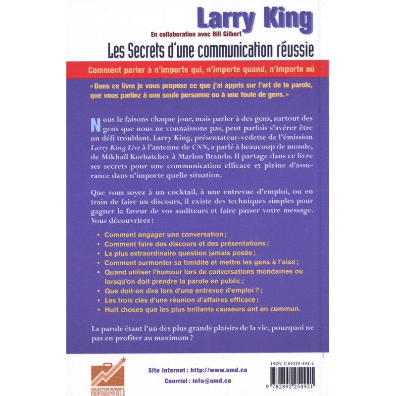 " Dans ce livre je vous propose ce que j'ai appris sur l'art de la parole, que vous parliez à une seule personne ou à une foule de gens. " Nous le faisons chaque jour, mais parler à des gens, surtout des gens que nous ne connaissons pas, peut parfois s'avérer être un défi troublant. Larry King, présentateur-vedette de l'émission Larry King Live à l'antenne de CNN, a parlé à beaucoup de monde, de Mikhaïl Korbatchev à Marlon Brando. Il partage dans ce livre ses secrets pour une communication efficace et pleine d'assurance dans n'importe quelle situation. Que vous soyez à un cocktail, à une entrevue d'emploi, ou en train de faire un discours, il existe des techniques simples pour gagner la faveur de vos auditeurs et faire passer votre message. Vous découvrirez : Comment engager une conversation ; Comment faire des discours et des présentations ; La plus extraordinaire question jamais posée ; Comment surmonter sa timidité et mettre les gens à l'aise ; Quand utiliser l'humour lors de conversations mondaines ou lorsqu'on doit prendre la parole en public ; Que doit-on dire lors d'une entrevue d'emploi ? ; Les trois clés d'une réunion d'affaires efficace ; Huit choses que les plus brillants causeurs ont en commun. La parole étant l'un des plus grands plaisirs de la vie, pourquoi ne pas en profiter au maximum ?