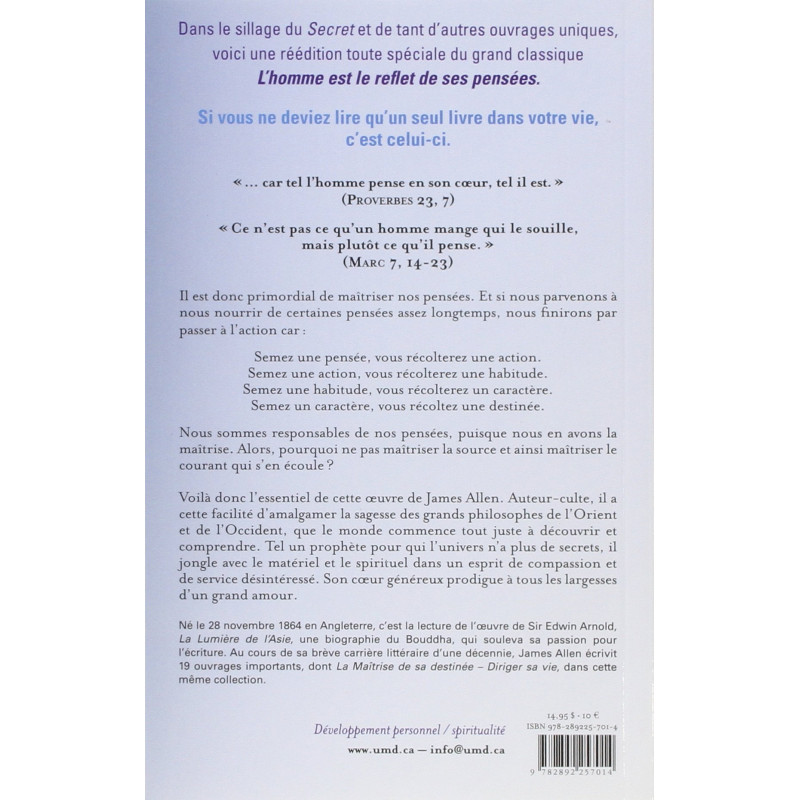 Dans le sillage du Secret et de tant d'autres ouvrages uniques, voici une réédition toute spéciale du grand classique de croissance personnelle : L'homme est le reflet de ses pensées. Nous sommes responsables de nos pensées, puisque nous en avons la maîtrise. Alors, pourquoi ne pas maîtriser la source et ainsi maîtriser le courant qui s'en écoule ? Voilà donc l'essentiel de l'oeuvre de James Allen. Auteur-culte, il a la facilité d'amalgamer la sagesse des grands philosophes de l'Orient et de l'Occident, que le monde commence tout juste à découvrir et comprendre. Tel un prophète pour qui l'univers n'a plus de secrets, il jongle avec le matériel et le spirituel dans un esprit de compassion et de service désintéressé. Son cœur généreux prodigue à tous les largesses d'un grand amour.