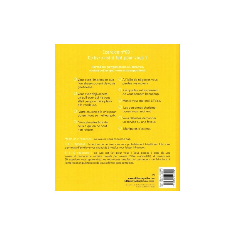 6 à 10 réponses : ce livre est fait pour vous ! Vous passez à côté de vos envies et renoncez à certains projets par crainte d'être manipulé(e). A travers ces 50 exercices vous apprendrez les techniques simples qui permettent de faire face à l'emprise manipulatoire et de vous affirmer sans complexe.