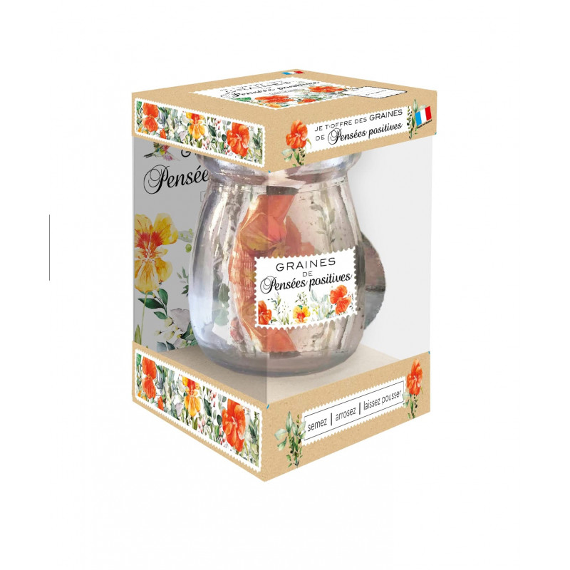 Un joli flacon d'apothicaire muni de graines de capucines et de pastilles de tourbe ainsi qu'un livret avec des citations inspirantes pour semer la chance à tout vent...