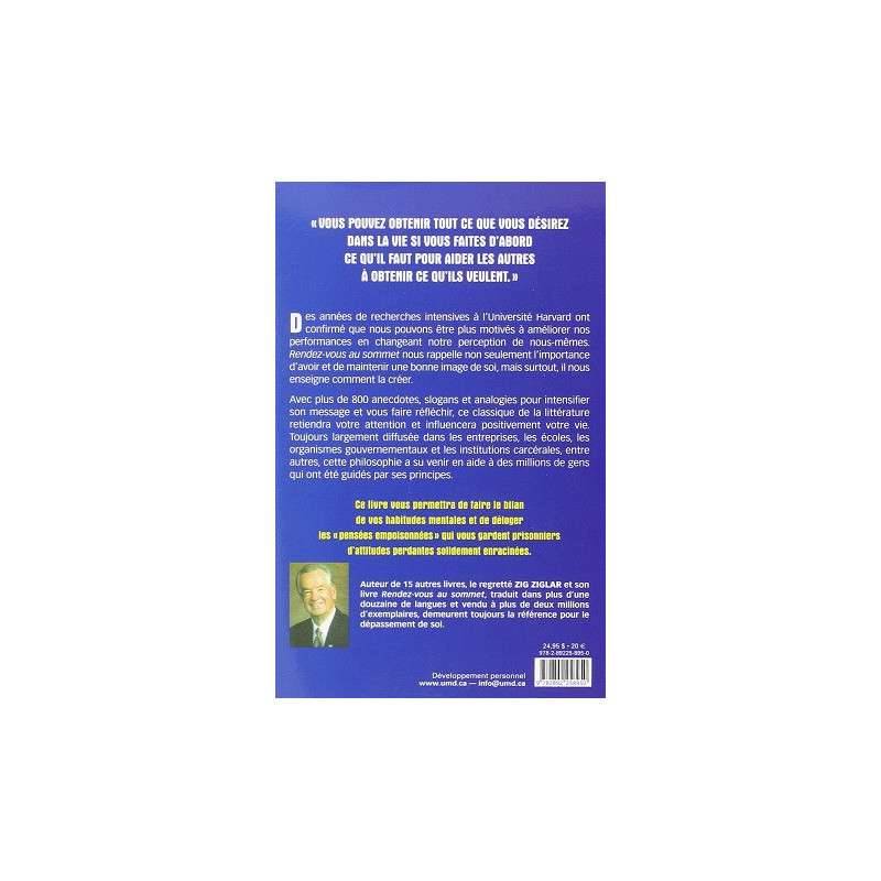 Des années d'intensives recherches à l'Université de Harvard ont confirmés que nous pouvons modifier notre motivation et améliorer nos performances en changeant la façon de nous percevoir comme individus. Rendez-vous au sommet nous rappel de l'importance d'avoir et de maintenir une bonne image de soi et surtout nous enseigne sur le comment la créer. Avec plus de 800 anecdotes, slogans et analogies pour intensifier les propos avancés et vous faire réfléchir, ce classique de la littérature retiendra votre attention et affectera positivement votre vie. Toujours largement diffusée dans les entreprises, les écoles, les organismes gouvernementaux et institutions carcérales, entre autre, cette philosophie a su venir en aide à des millions d'individus qui se sont laissé guider par ses principes.
