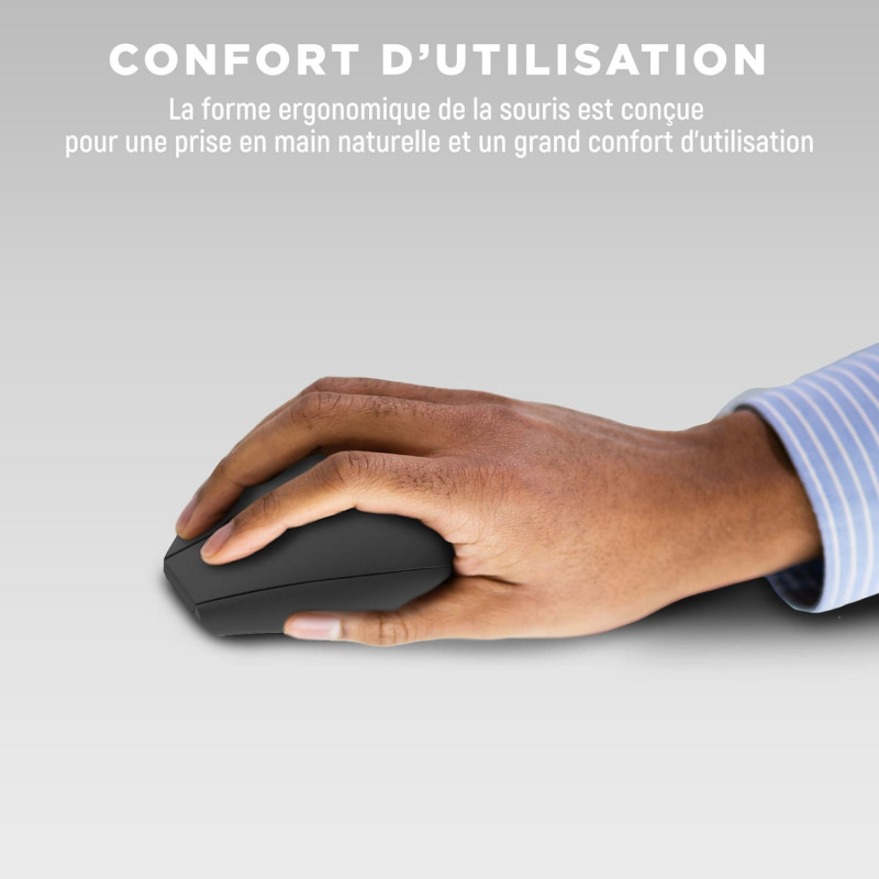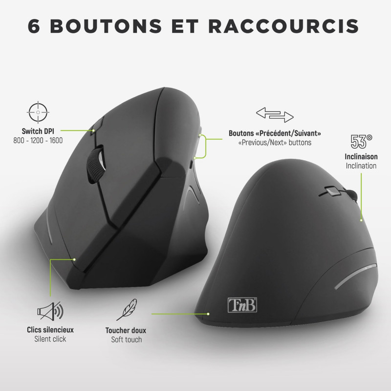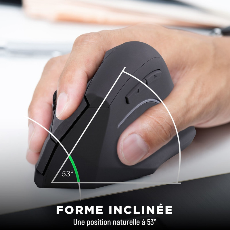 Design optimisé pour une utilisation confortable. Sa forme verticale permet d'adopter une position naturelle, au niveau du bras, du poignet et de la main. Sur le long terme, la souris verticale soulage les muscles et évite les douleurs et Troubles Musculo-Squelettiques (TMS). - 6 boutons (dont "suivant", "précédent", réglage dpi, molette cliquable). - Double mode de connexion Bluetooth et USB-A 2,4 GHz