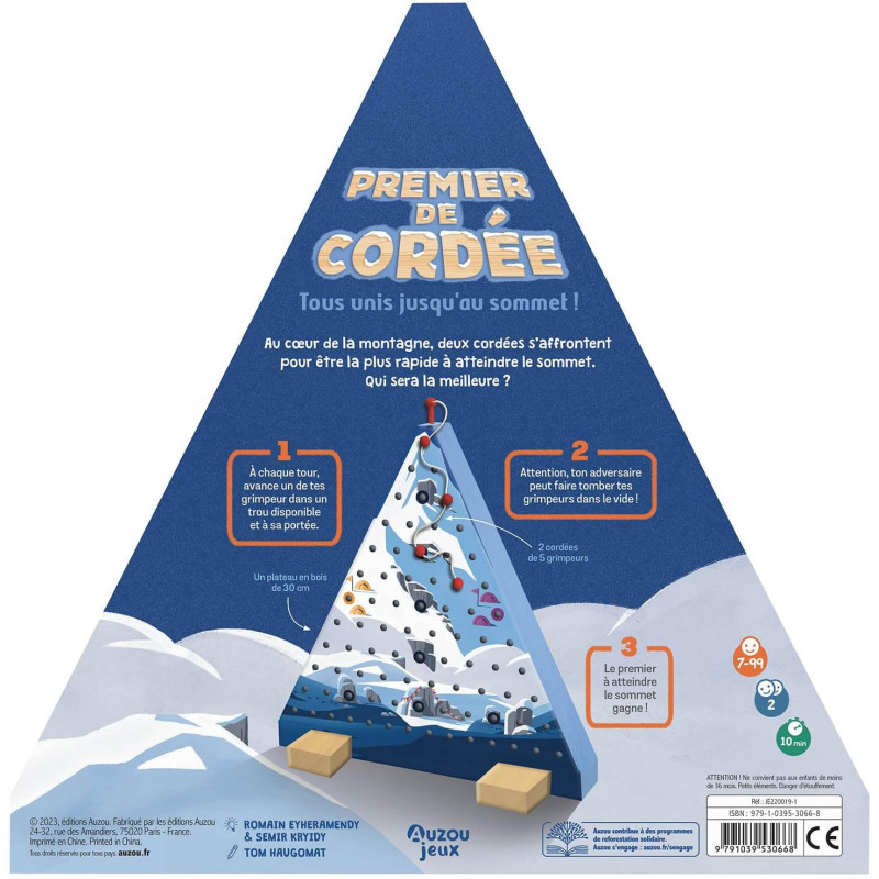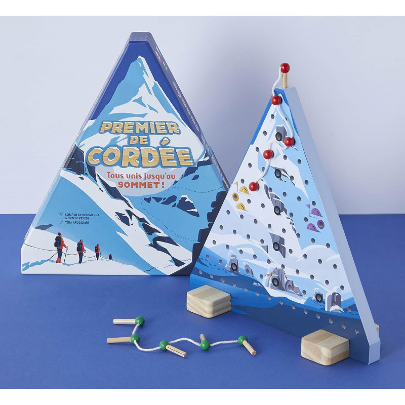 Au coeur de la montagne, deux cordées de 5 grimpeurs s'affrontent pour être la plus rapide à atteindre le sommet. Quel joueur sera le plus stratégique pour parvenir à hisser en premier sa cordée en haut de la montagne ? Contenu : 1 plateau en bois de 30 cm de haut et 2 cordées