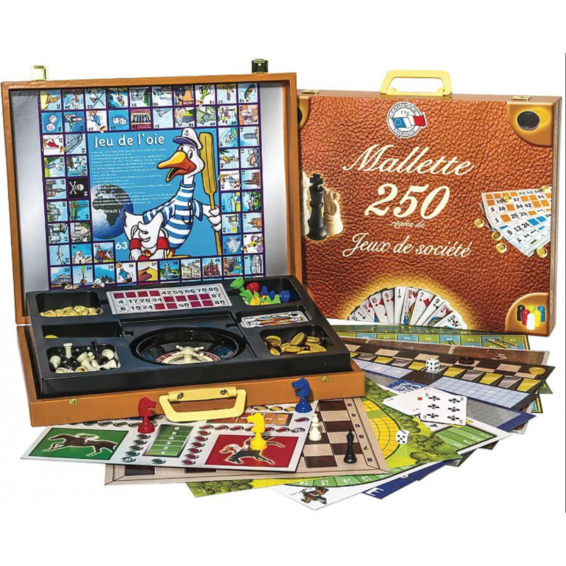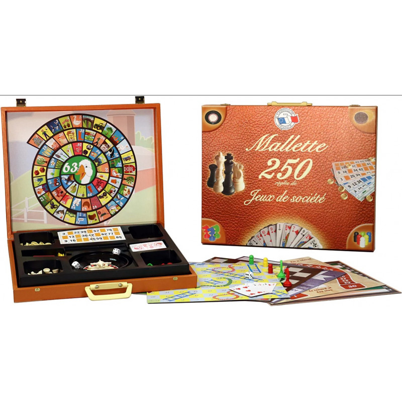 Malette contenant de nombreux accessoires pour réaliser 250 jeux (chevaux, dames, oies, échecs, roulette, loto, dés, cartes, etc ..).