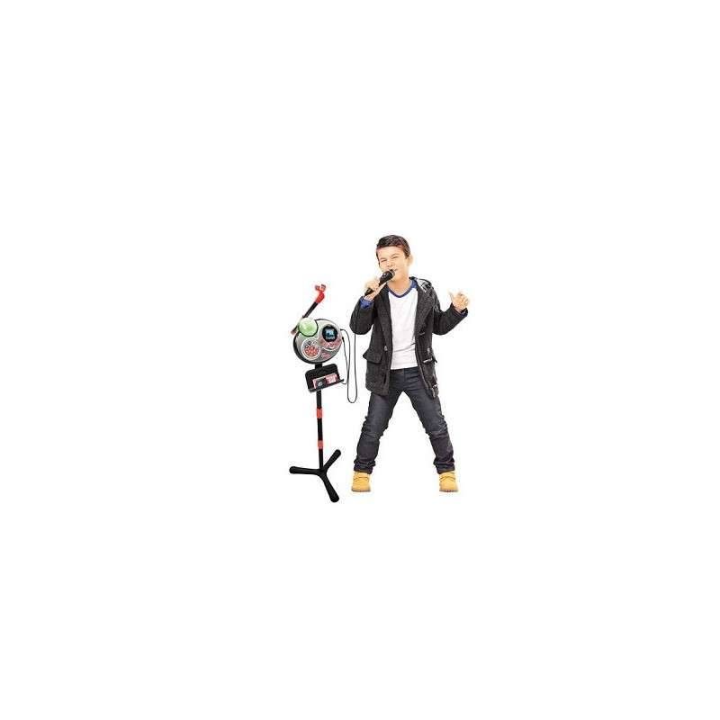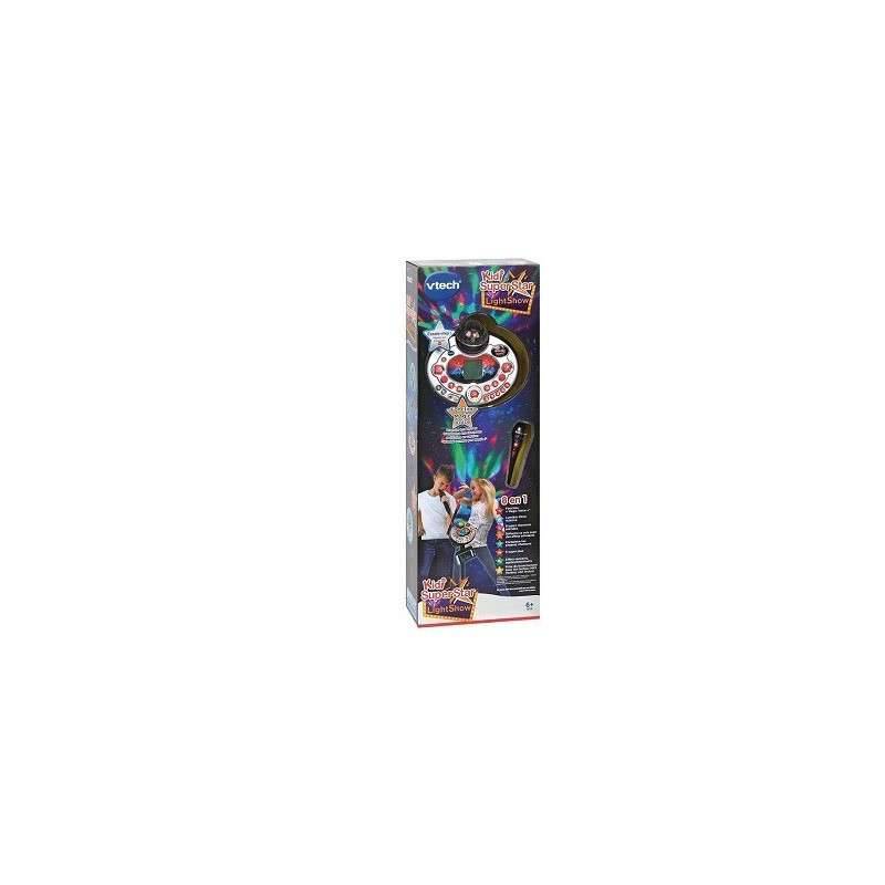 Kidi SuperStar noir - 6 ans et + Ce super micro permet de chanter en karaoké sur ses chansons préférées. Il suffit de brancher son lecteur MP3 grâce au câble inclus et de chanter sur ses mélodies favorites. Grâce à sa technologie innovante « Magic Voice », Kidi Super Star joue la mélodie du titre sans les paroles pour chanter librement. Fonctionne avec la très grande majorité des chansons (sauf enregistrements en live). Avec un écran interactif rétroéclairé qui affiche des animations. Plein d'effets de lumières qui varient selon l'intensité de la chanson et une super boule disco orientable. Possibilité d'enregistrer sa voix avec ou sans la mélodie (jusqu'à 5 minutes d'enregistrement). 6 super jeux : déformation de la voix, découverte des instruments de musique et leur sonorité, exercices sur le rythme, jeux de prononciation… Déformation de la voix grâce à plein d'effets rigolos (écho, robot…). Le micro est orientable et la base est amovible pour chanter comme les pros et l'emporter partout avec soi ! Applaudissements, encouragements, plein d'autres effets de concert et 8 super chansons animées préenregistrées. Hauteur ajustable jusqu'à 1m40. Câble jack pour raccorder avec MP3, mini chaîne, lecteur CD, etc. Boîte fermée. 4 piles LR6 incluses et compatible avec l'adaptateur secteur VTech (vendu séparément).