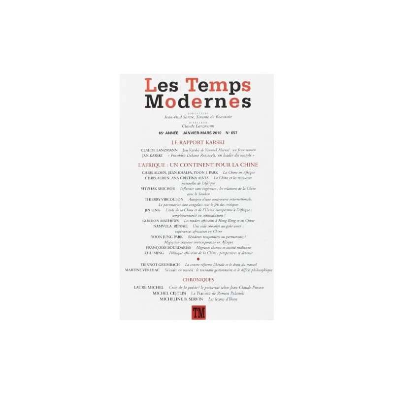 Le rapport Karski : Claude Lanzmann, Jan Karski de Yannick Haenel : un faux roman Jan Karski, «Franklin Delano Roosevelt, un leader du monde»L'Afrique : un continent pour la Chine : Chris Alden - Jean Khalfa - Yoon Jung Park, La Chine en AfriqueChris Alden - Ana Cristina Alves, La Chine et les ressources naturelles de l'AfriqueYitzhak Shichor, Influence sans ingérence : les relations de la Chine avec le SoudanThierry Vircoulon, Autopsie d'une controverse internationale : le partenariat sino-congolais sous le feu des critiques Jin Ling, L'aide de la Chine et de l'Union européenne à l'Afrique : complémentarité ou contradiction ?Gordon Mathews, Les traders africains à Kong Hong et en ChineNamvula Rennie, Une ville chocolat au goà»t un peu amer : Expériences affricaines en ChineYoon Jung Park, Résidents temporaires ou permanents ? Migration chinoise contemporaine en AfriqueFranà§oise Bourdarias, Migrants chinois et société malienne : Les constructions locales de la mondialisation Zhu Ming, Politique africaine de la Chine : perspectives et devenirTiennot Grumbach, La contre-réforme libérale et le droit du travailMartine Verlhac, Suicides au travail : le tournant gestionnaire et le déficit philosophiqueChroniques : Laure Michel, Crise de la poésie ? Le poétariat selon Jean-Claude PinsonMichel Cejtlin, Le pianiste de Roman PolanskiMicheline B. Servin, Les leà§ons d'Ibsen