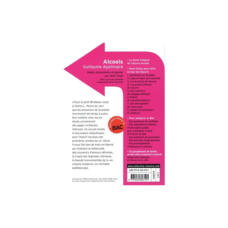 Sous le pont Mirabeau coule la Seine"... Parmi les vers que les amoureux de la poésie murmurent de temps à autre, bon nombre, sans aucun doute, proviennent des pages vivifiantes d'Alcools. Ce recueil révèle la fascination d'Apollinaire pour l'esprit nouveau des premières années du XXe siècle. Il nous fait don de mots en liberté qui chantent la mélancolie des souvenirs d'amours défuntes, la magie des légendes rhénanes, la beauté mouvementée de la vie urbaine moderne. Un véritable kaléidoscope.