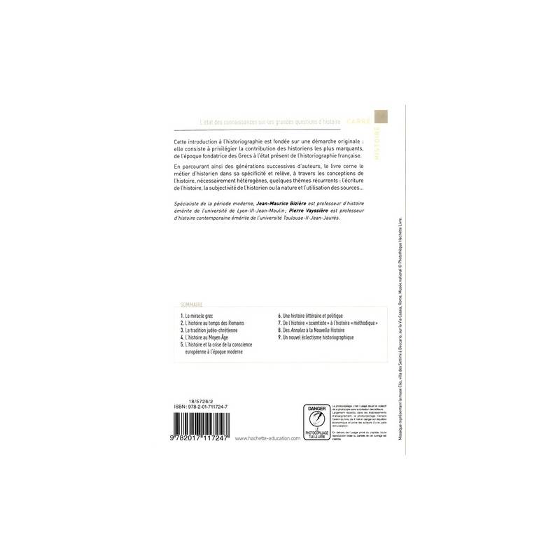 La démarche de cet ouvrage est originale et consiste à privilégier la contribution des historiens les plus marquants, de l'époque fondatrice des Grecs à l'état présent de l'historiographie française.