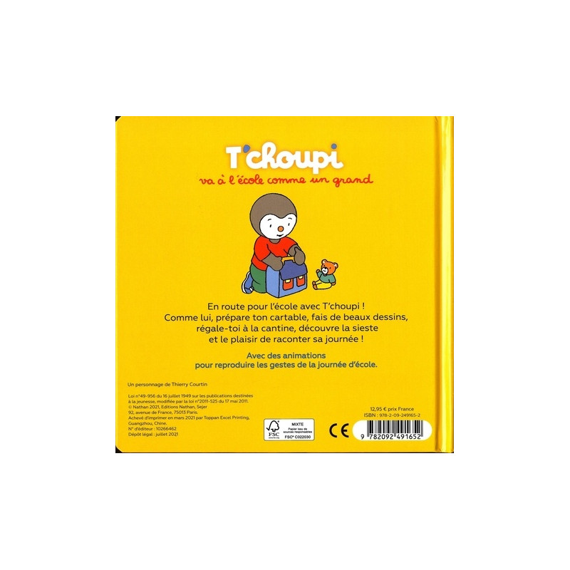 Les livres animés T'choupi pour tout faire comme un grand ! Grâce aux animations, va à l'école comme un grand avec T'choupi et comme lui : - Prépare ton cartable - Colorie un dessin - Choisis ton repas à la cantine - Joue dans la cour - Trouve ton doudou pour la sieste - Et raconte tes moments préférés de la journée ! Une histoire animée pour les enfants dès 2 ans.