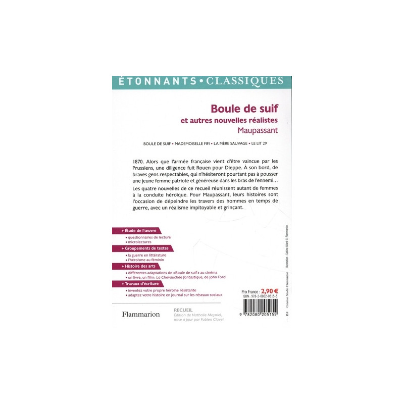+ Etude de l'oeuvre- questionnaires de lecture- microlectures+ Groupements de textes- la guerre en littérature- l'héroïsme au féminin+ Histoire des arts- différentes adaptations de "Boule de suif" au cinéma- un livre, un film : La Chevauchée fantastique, de John Ford+ Travaux d'écriture- inventez votre propre héroïne résistante- adaptez votre histoire en journal sur les réseaux sociaux. Ce volume contient : BOULE DE SUIF - MADEMOISELLE FIFI - LA MERE SAUVAGE - LE LIT 29.