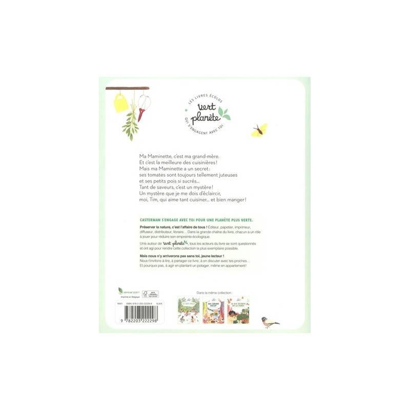 Ma Maminette, c'est ma grand-mère. Et c'est la meilleure des cuisinières ! Mais ma Maminette a un secret : ses tomates sont toujours tellement juteuses et ses petits pois si sucrés... Tant de saveurs, c'est un mystère ! Un mystère que je me dois d'éclaircir, moi, Tim, qui aime tant cuisiner... et bien manger !