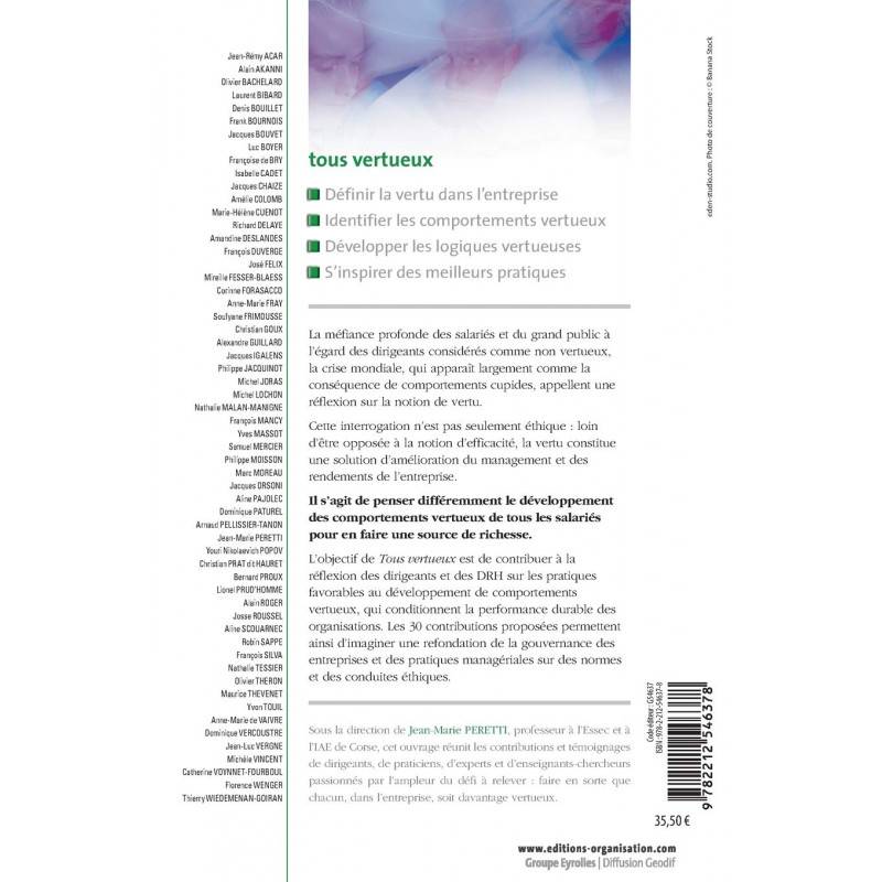 La méfiance profonde des salariés et du grand public à l'égard des dirigeants considérés comme non vertueux, la crise mondiale, qui apparaît largement comme la conséquence de comportements cupides, appellent une réflexion sur la notion de vertu. Cette interrogation n'est pas seulement éthique : loin d'être opposée à la notion d'efficacité, la vertu constitue une solution d'amélioration du management et des rendements de l'entreprise. Il s'agit de penser différemment le développement des comportements vertueux de tous les salariés pour en faire une source de richesse. L'objectif de Tous vertueux est de contribuer à la réflexion des dirigeants et des DRH sur les pratiques favorables au développement de comportements vertueux, qui conditionnent la performance durable des organisations. Les 30 contributions proposées permettent ainsi d'imaginer une refondation de la gouvernante des entreprises et des pratiques managériales sur des normes et des conduites éthiques.