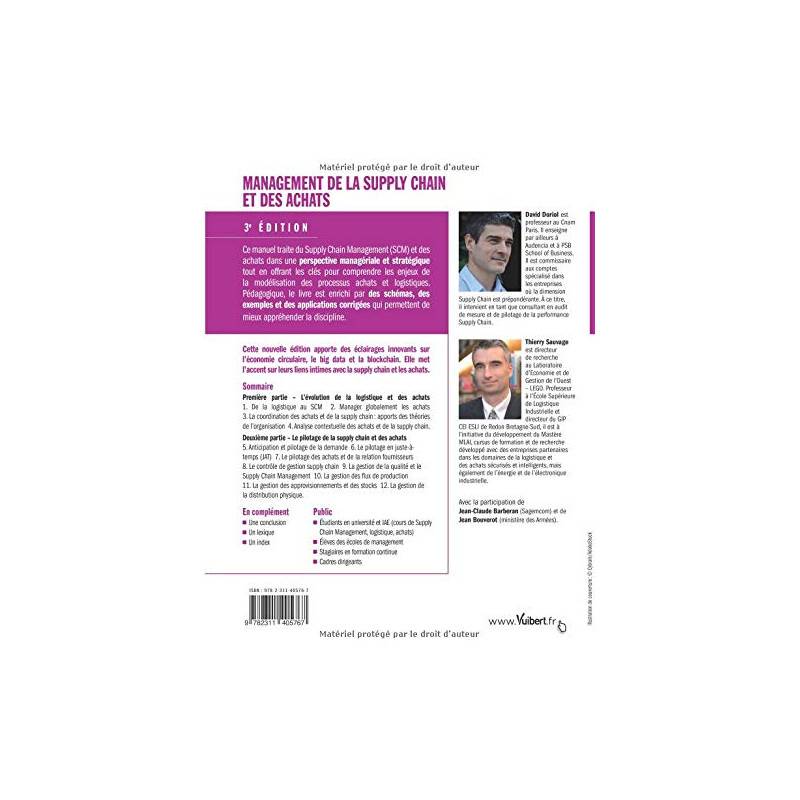 Un ouvrage complet, pédagogique et à jour des évolutions de la supply chain. Ce livre propose une vision managériale et stratégique de la supply chain et de la fonction Achats. Les auteurs fournissent les clés pour comprendre les enjeux de la modélisation des processus achats et logistiques. Les chapitres sont illustrés d'exemples, d'exercices et d'études de cas permettant de mieux appréhender les notions traitées.