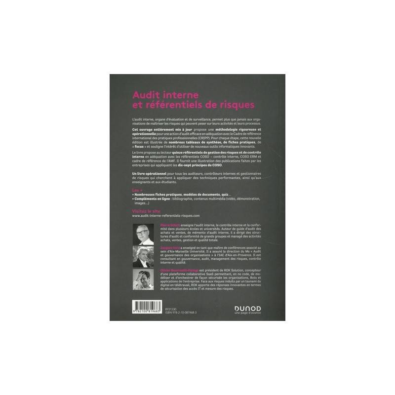 Le livre propose au lecteur quinze référentiels de gestion des risques et de contrôle interne en adéquation avec les référentiels COSO contrôle interne, COSO ERM et cadre de référence de l'AMF. Il fournit une illustration des publications faites par les entreprises qui appliquent les dix-sept principes du COSO. Un livre opérationnel pour tous les auditeurs, contrôleurs internes et gestionnaires de risques qui cherchent à appliquer des techniques performantes, ainsi qu'aux enseignants et aux étudiants.