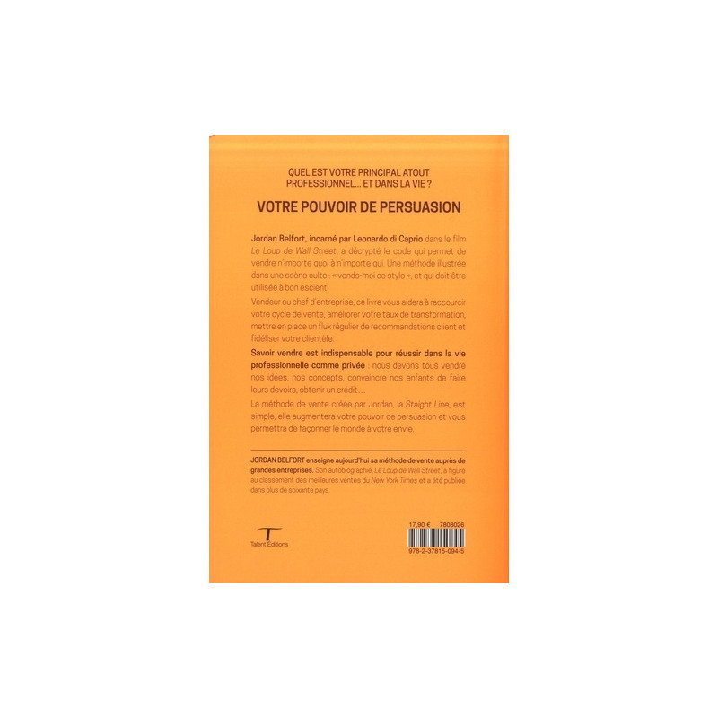 Quel est votre principal atout professionnel... et dans la vie ? VOTRE POUVOIR DE PERSUASION Jordan Belfort, incarné par Leonardo di Caprio dans le film Le Loup de Wall Street, a décrypté le code qui permet de vendre n'importe quoi à n'importe qui. Une méthode illustrée dans une scène culte : "vends-moi ce stylo" , et qui doit être utilisée à bon escient. Vendeur ou chef d'entreprise, ce livre vous aidera à raccourcir votre cycle de vente, améliorer votre taux de transformation, mettre en place un flux régulier de recommandations client et fidéliser votre clientèle. Savoir vendre est indispensable pour réussir dans la vie professionnelle comme privée : nous devons tous vendre nos idées, nos concepts, convaincre nos enfants de faire leurs devoirs, obtenir un crédit... La méthode de vente créée par Jordan, la Staight Line, est simple, elle augmentera votre pouvoir de persuasion et vous permettra de façonner le monde à votre envie.
