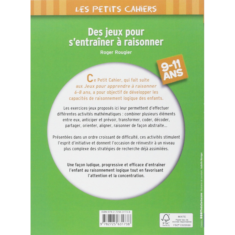 Cette nouvelle édition en couleurs offre aux enfants, dans des contextes toujours ludiques et variés, un contenu pointu qui se concentre sur les compétences de base et les savoirs fondamentaux en matière de calcul. Des jeux pour s’entraîner à raisonner – 9/11 ans : ce petit cahier a pour objectif de développer les capacités de raisonnement logique des enfants. Les exercices-jeux proposés leur permettent d’effectuer différentes activités mathématiques : combiner plusieurs éléments entre eux, anticiper et prévoir, transformer, coder, décoder, partager, orienter, aligner, raisonner de façon abstraite…