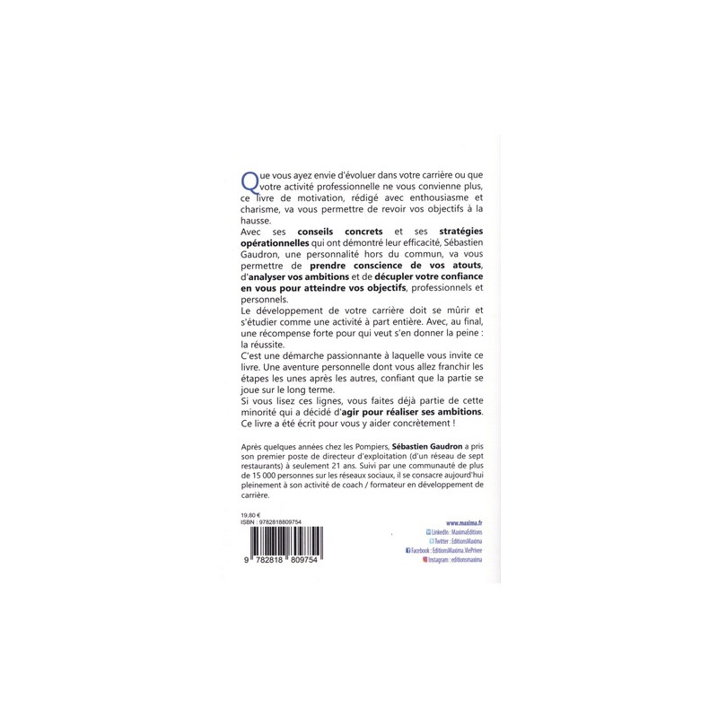 Et si c'était maintenant, le moment de passer à la vitesse supérieure dans votre entreprise ou ailleurs Il l'a fait avec succès, faites comme lui. Ce livre vous dit tout pour booster votre carrière. Que vous ayez envie d'évoluer dans votre carrière ou que votre activité professionnelle ne vous convienne plus, il est important de faire le bilan. Avec ce livre, vous avez la possibilité de revoir vos objectifs à la hausse, grâce à de nombreuses stratégies concrètes pour développer votre carrière comme vous le voulez.